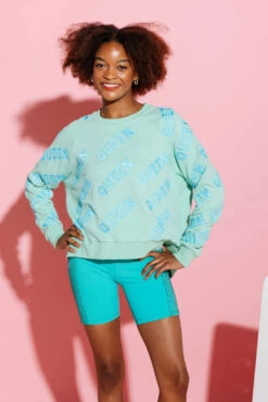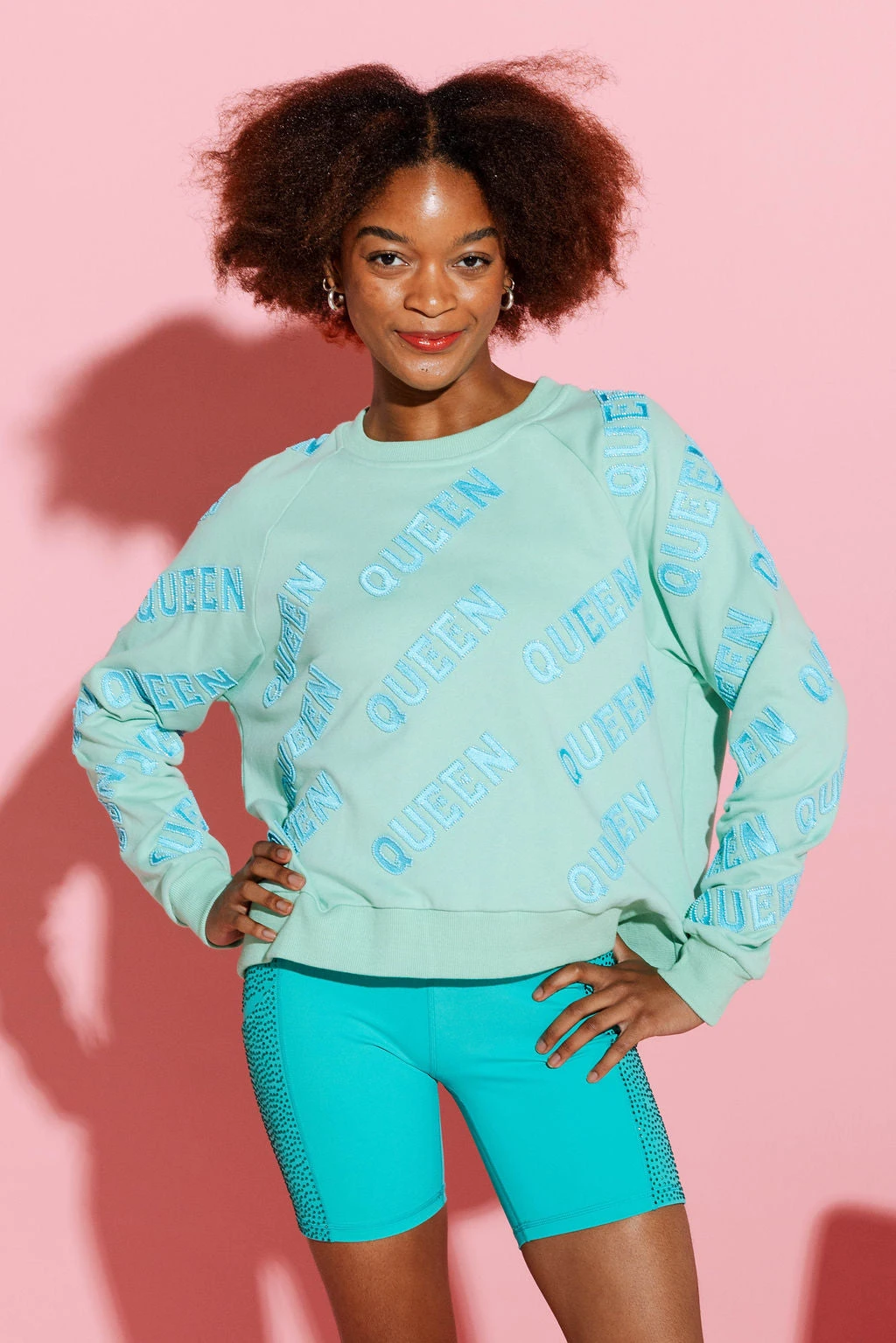 This oversized sweatshirt features a beaded “QUEEN” design all over. To preserve its quality, hand wash it inside out.