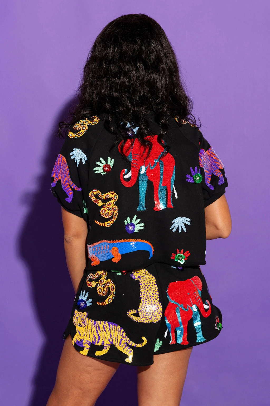 Stay cool and comfortable in these stylish Black Multi Animal Shorts. Crafted with a high waisted, loose fit, these shorts feature an eye-catching all-over sequin animal design for an on-trend look. Perfect when paired with the matching top or sweatshirt for a complete outfit.