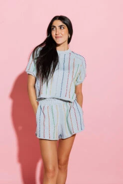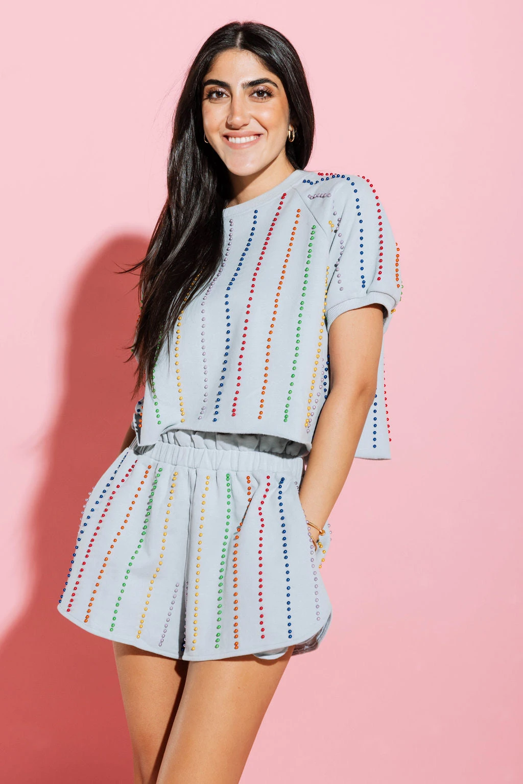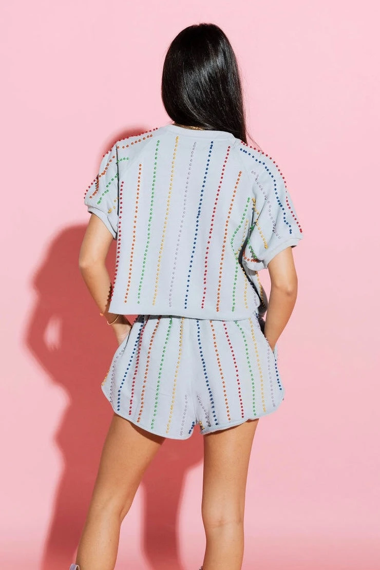 This loungewear set features shorts with a loose, high-waisted fit and pearl design all over. Don’t forget to complete the look with the matching top!