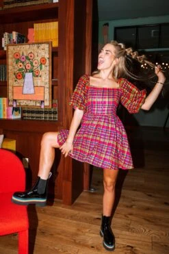 Queen Of Sparkles Hot Pink Plaid Poof Sleeve Dress