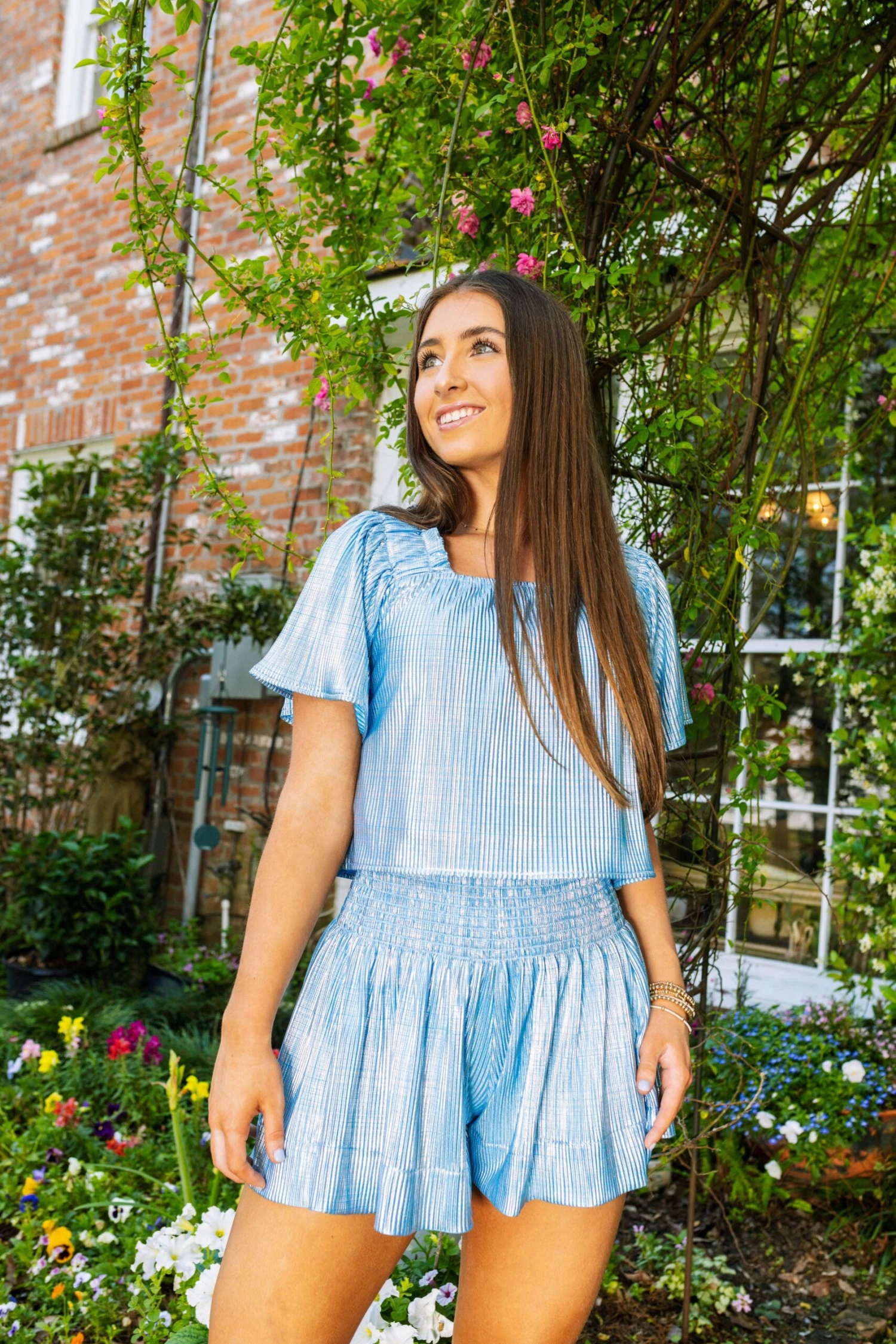 Queen Of Sparkles Light Blue & Silver Ribbed Flutter Top