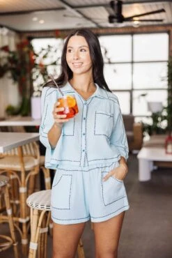 Queen Of Sparkles Light Teal & Black Gauze Rhinestone Trim Top