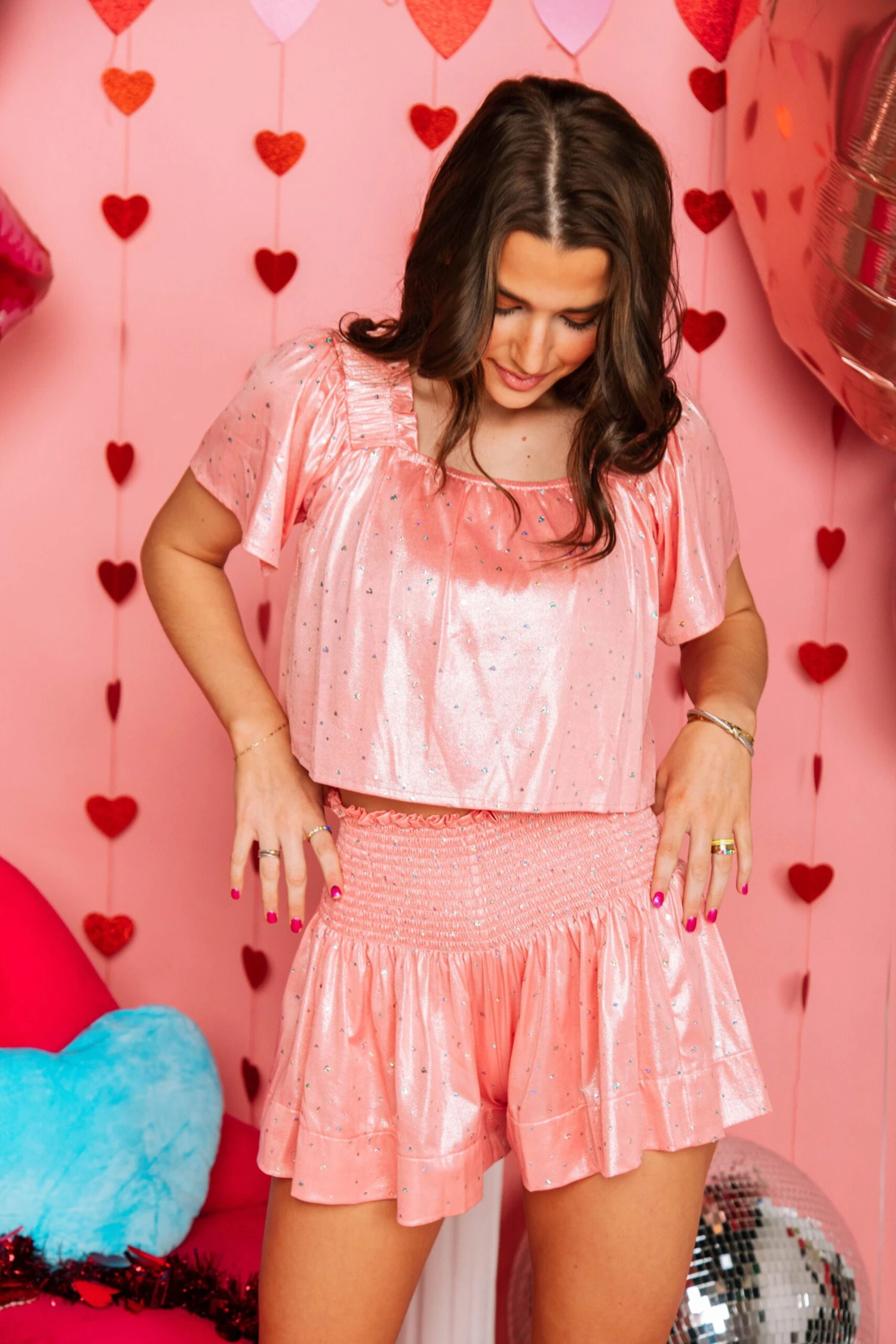 Queen Of Sparkles Peach Glitter Hearts Flutter Top