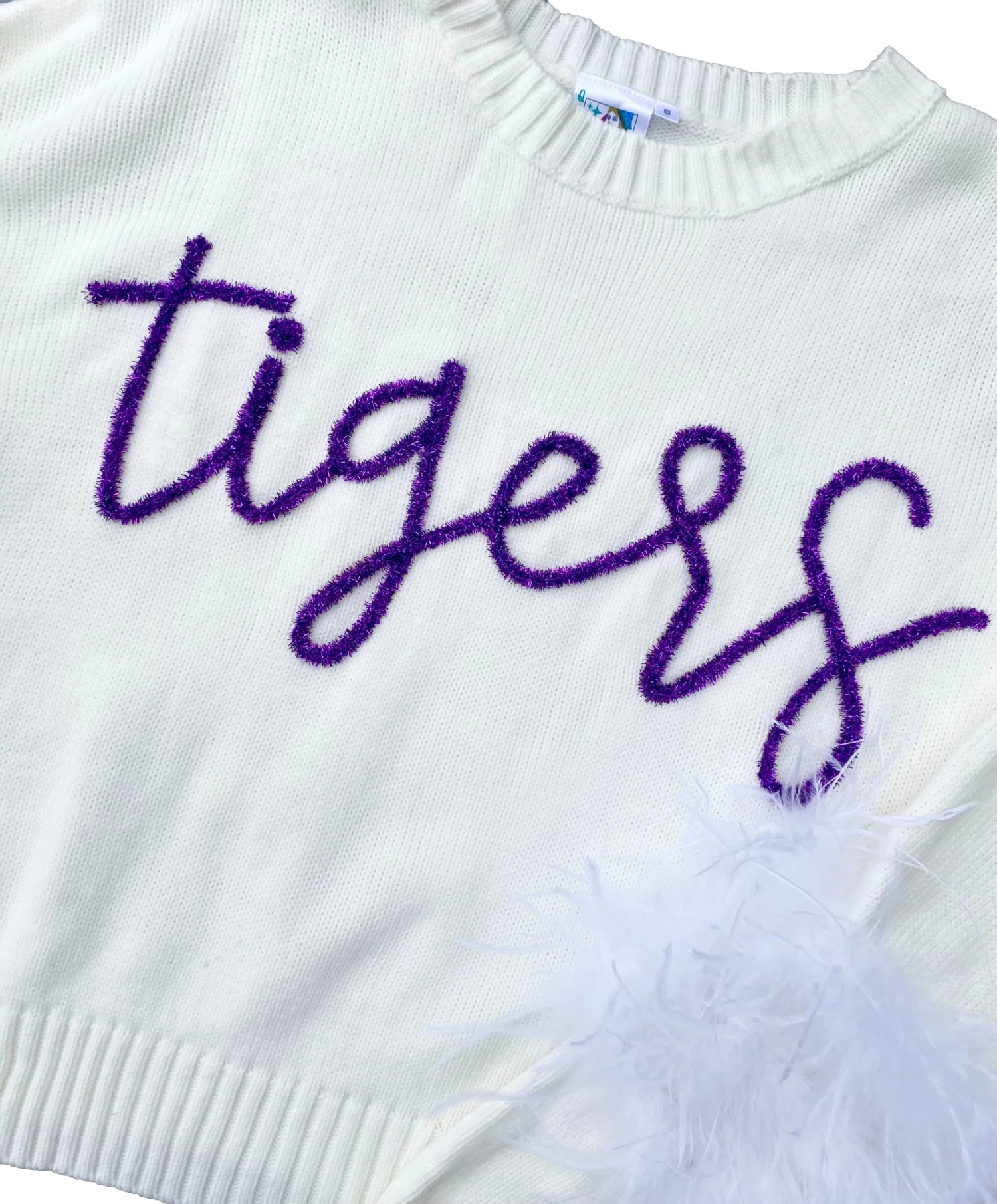 Queen Of Sparkles Purple“Tigers” Feather Sleeve Sweater