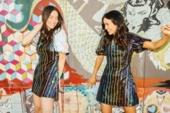 Queen Of Sparkles Rainbow Sequin Stripe Dress With Black Sleeves