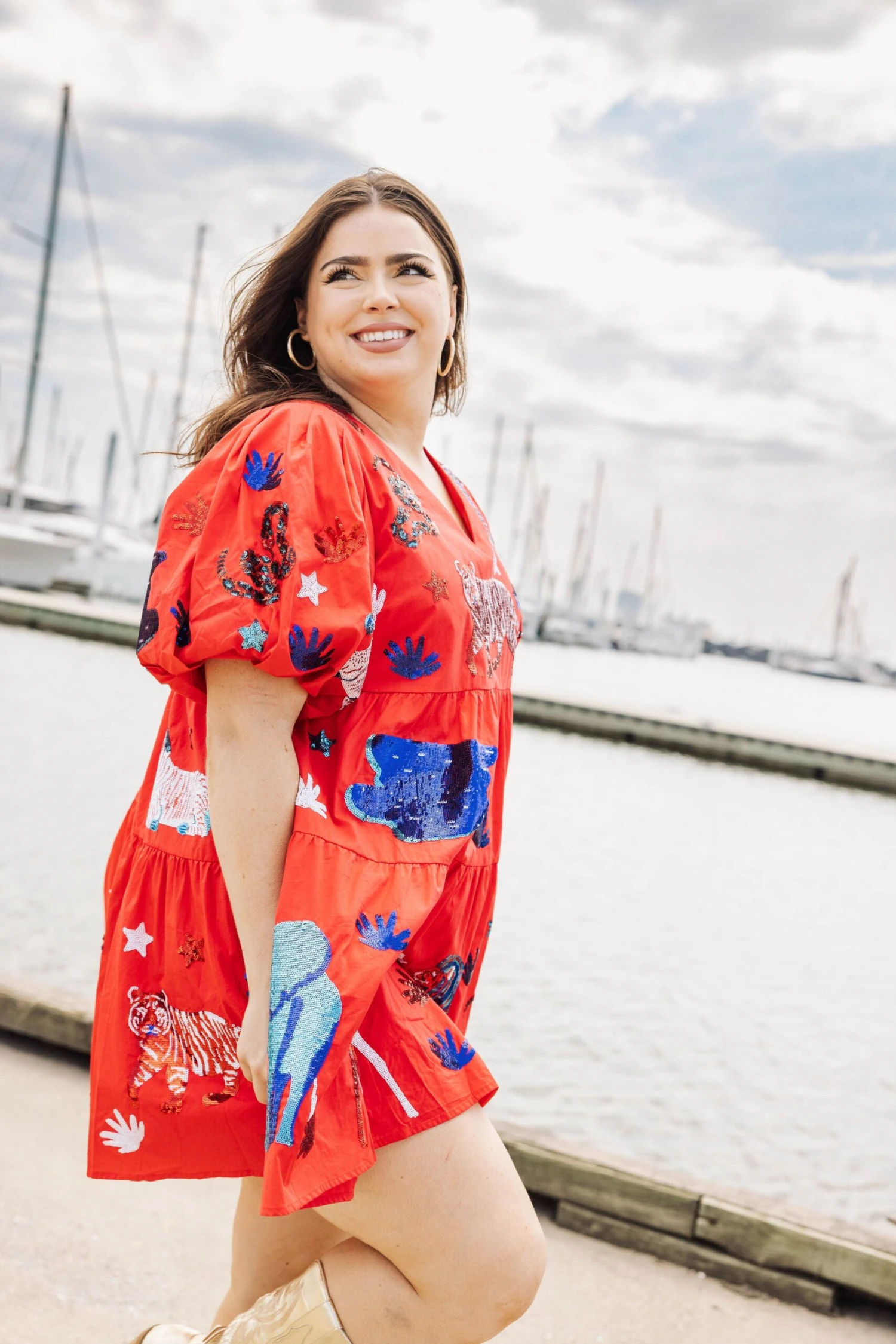 Queen Of Sparkles Red, White, And Blue Animal Poof Sleeve Dress